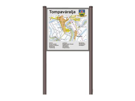 Egyszerű térképes infotábla, egyoldalas színes térképpel, felírattal ellátva színre eloxált aluoszlop. ?76 mm bronzbarna. Szélesség: 1000 mm, Magasság: 2000 mm, Táblaméret: 1000x1000 mm. Lebetonozható kivitelben.