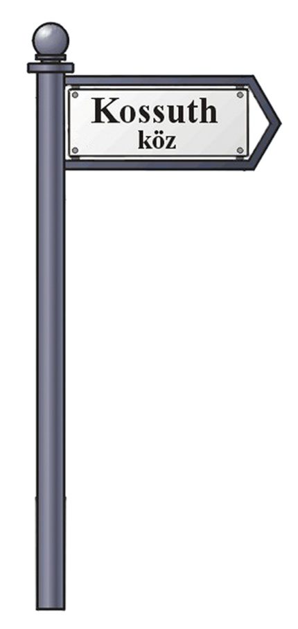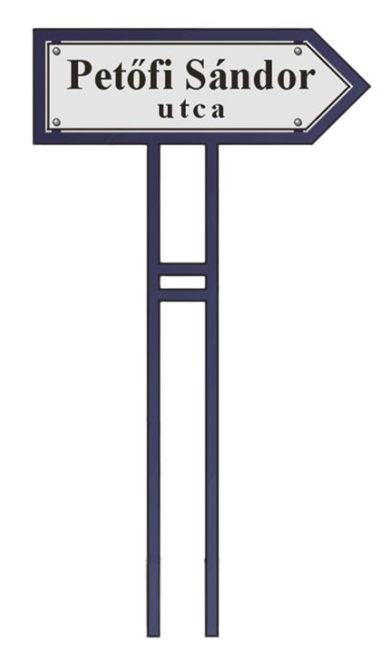 Lábon álló utcanévtábla, nyíl alakú. Acélszelvény: ?20x20x2 mm, Szélesség: 570 mm, Magasság: 1100 mm, Táblaméret: 500x150 mm. Lebetonozható kivitelben.