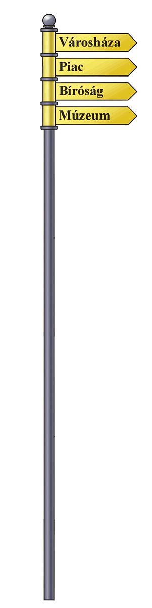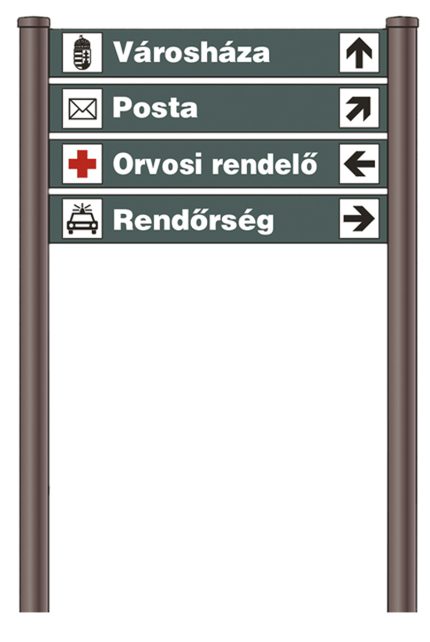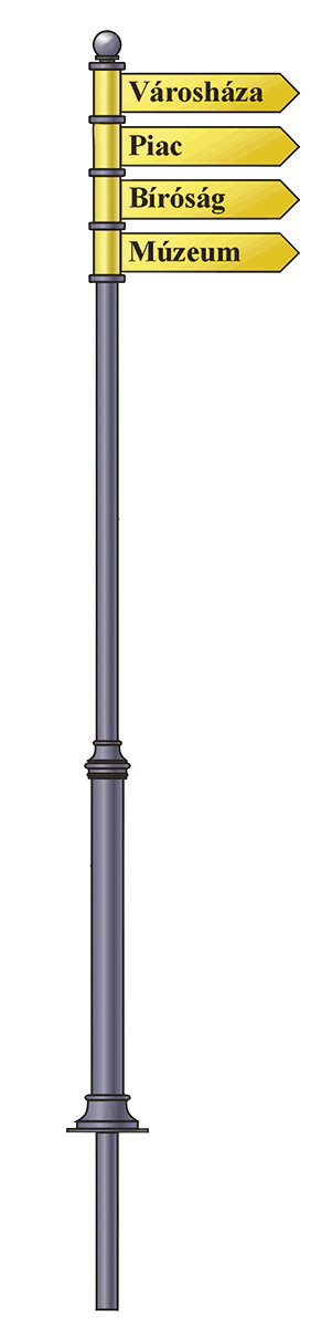 Több irányba mutató oszlopos tábla, öntvény díszelem, távtartó gyűrűk. Acélcső oszlop:?60x2 mm, oszlop magasság: 3000 mm, Táblaméret: 500x100 mm, Tábla. 1,5 mm-es acéllemez. Betételem külön rendelhető.
