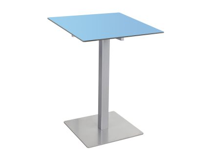 Horganyzott központi lábas, 60x60 mm-es acéloszlopos asztal, 45x45 cm-es acéllemez talppal. Az acéllemez talp alján szintező talpak találhatók, amelyek lehetővé teszik a padló egyenetlenségeinek kiküszöbölését. 12 mm vastag kompaktlemez asztallappal, amely ellenáll a kültéri viszontagságoknak, maximum 80 cm átmérőjű vagy 80x80 cm-es méretben ajánlott. Kültéren is alkalmazható.